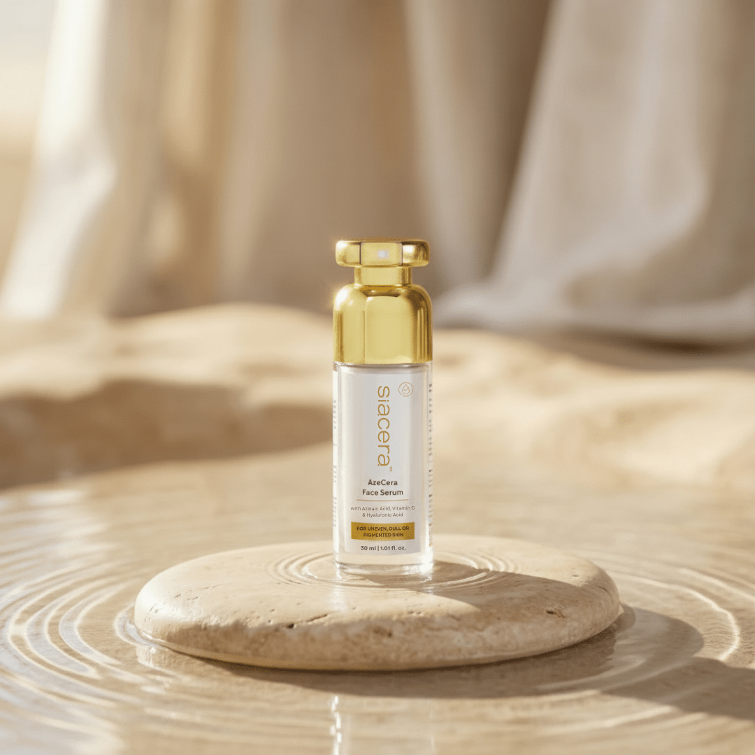 AzeCera Face Serum pairs Azelaic Acid with a stable form of Vitamin C (3-O Ethyl Ascorbic Acid) and Licorice Extract to target uneven tone, dark spots, redness, and post-acne marks—without irritation. This lightweight, water-based serum smooths texture, boosts radiance, and restores balance for a clearer, more even complexion.